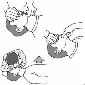 實施心肺復蘇時,首先用拳頭有節奏地用力叩擊患者前胸左乳頭內側的心臟部位2~3次,拳頭抬起時,離胸部20~30厘米,以掌握叩擊的力量。若脈搏仍未恢復搏動,應立即連續做4次口對口人工呼吸,接著再做胸外心臟按壓。一人施行心肺復蘇時,每做15次心臟按壓,再做次人工呼吸。兩人合作進行心肺復蘇時,先連做4次人工呼吸,隨后,一人連續做5次心臟按壓后停下,另一人做一次人工呼吸。